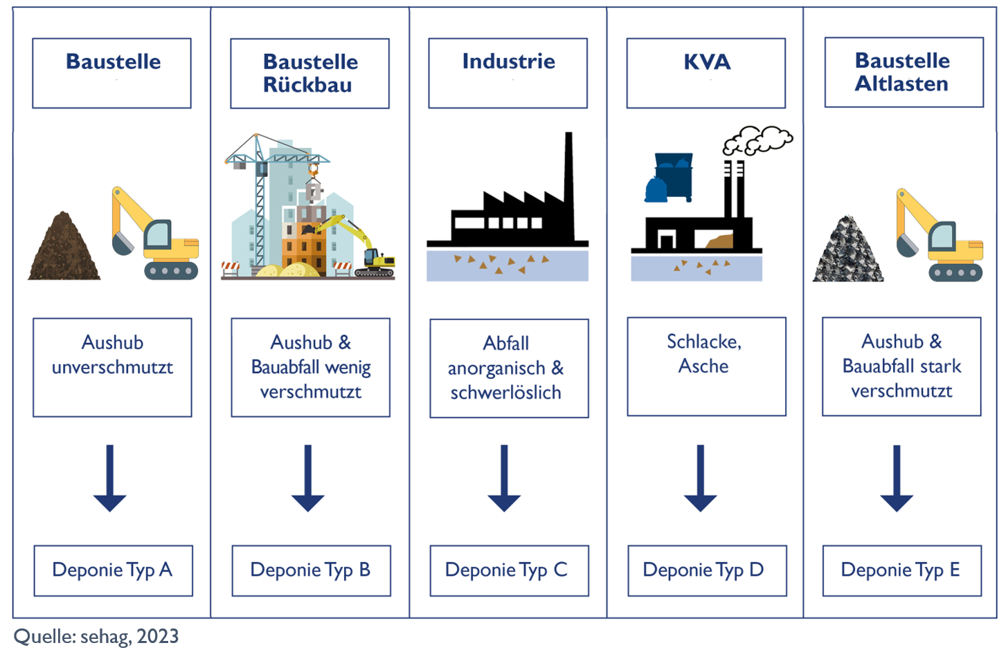 Die Schweizer Bevölkerung ist fleissig am Renovieren, am Rück- und Neubauen. Bei diesen Arbeiten entstehen unter anderem grosse Mengen an unverschmutztem Aushubmaterial (Typ A), schwach und wenig verschmutztem Aushubmaterial sowie mineralische Bauabfälle (Typ B). Diese Materialien werden grösstenteils recycelt und wiederverwendet.